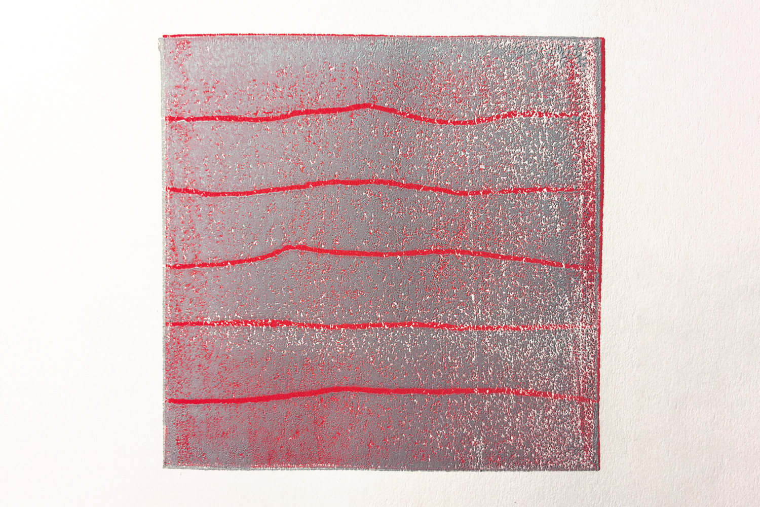 This is the first time I tried printing two colors with tetra. Here I first printed a red surface and on top of that I printed silver with horizontal lines carved into the tetra. A tiny print of 6,5x6,5 cm on a 15x15 cm paper.